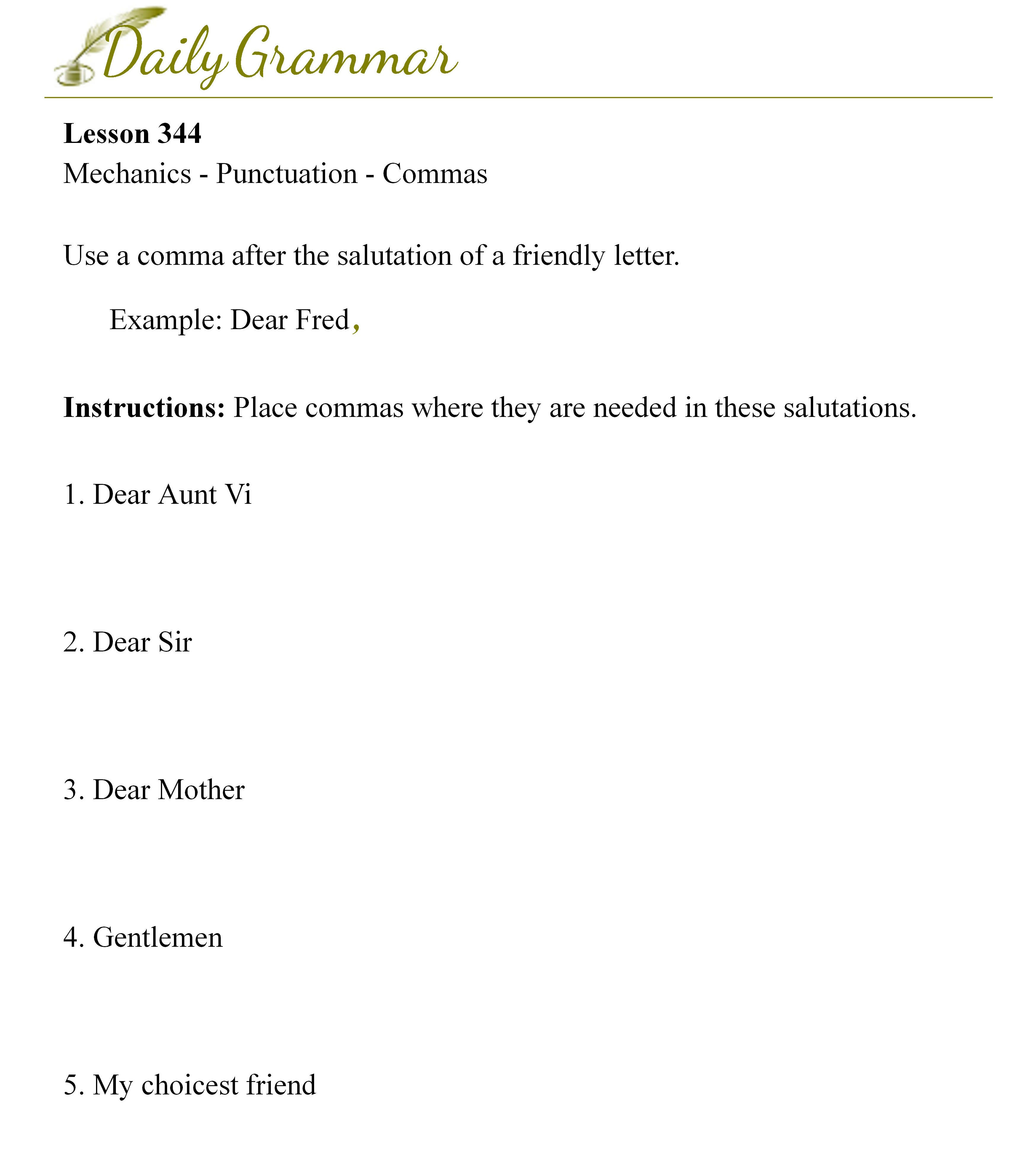 Lesson 344Mechanics - Punctuation - CommasDaily GrammarApr 09, 2026ShareView Lesson - Print LessonGo to Daily Grammar to View Answers